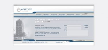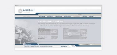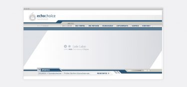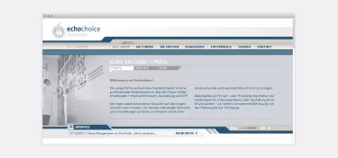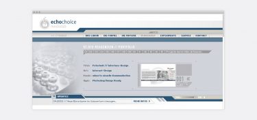 echochoice medialab Screendesign und Erstellung einer Agenturwebsite in Flash Zielsetzungen war die Entwicklung eines modernen Designs und einer prägnanten Erscheinung. Date: Feb. 2003 Role: Screen-Designer Client: echochoice medialab Views: 4164 #Website Share: