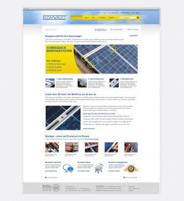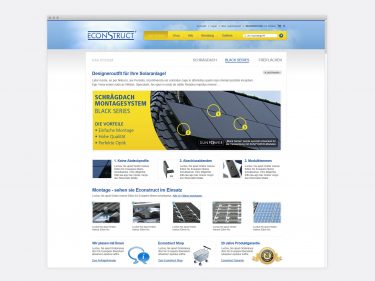 ECONSTRUCT ist ein hochwertiges „Design“-Montagesystem für Photovoltaikanlagen. Der Fokus liegt auf der einfachen Handhabung des Produktes. Dies spiegelt sich sowohl in der Benutzerführung, als auch in der übersichtlichen Shopfunktion wieder.